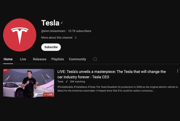 Na YouTubeu se pojavio live video prijenos Elona Muska u kojem je on punih pet sati pozivao gledatelje da posjete određenu web stranicu i na nju ulože svoje kriptovalute kako bi sudjelovali u nagradnoj igri s bogatim fondom nagrada, a ako to ne učine jako će zažaliti.