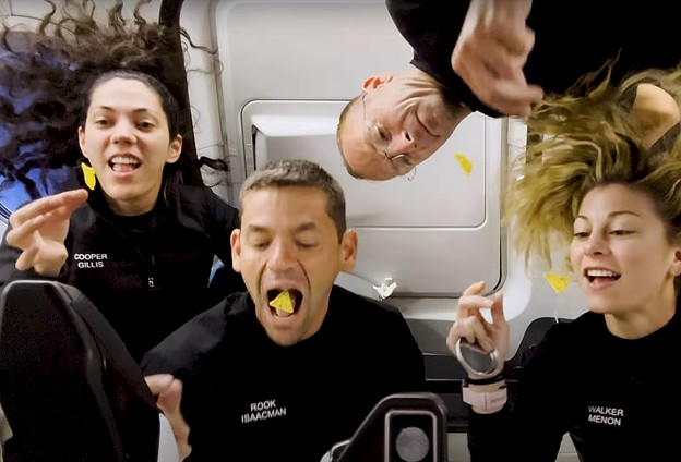 Sada znamo da je misija napravila još jedan iskorak, snimanjem prve "svemirske reklame" u kojoj Jared Isaacman, Scott "Kidd" Poteet, Sarah Gillis i Anna Menon hrskaju Doritosov "Zero Gravity Cool Ranch" čips dok lebde u bestežinskom stanju, kao što možete vidjeti u ovom videu.