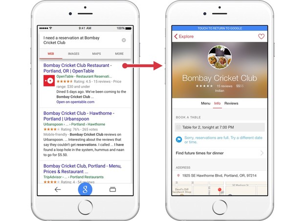 Sada je ista značajka, počevši od ovog tjedna omogućena u Google App aplikaciji i Chrome pregledniku za iOS. Treba reći da značajka za sada nije univerzalna, odnosno neće prikazivati poveznice iz svih aplikacija koje imate instalirane na iPhoneu ili iPadu, već samo one iz aplikacija Googleovih partnera koji uključuju Eat24, Free Dictionary, Huffington Post, OpenTable, Pinterest, SeatGeek, Slideshare, Tapatalk, Yellow Pages, YouTube i Zillow. Ukoliko na svojem iPhoneu ili iPadu nemate niti jednu od podržanih aplikacija, ne morate se brinuti, jer je Google danas najavio da će započeti s prikazivanjem poveznica iz aplikacija koje još niste instalirali, ali biste mogli (trebali).
