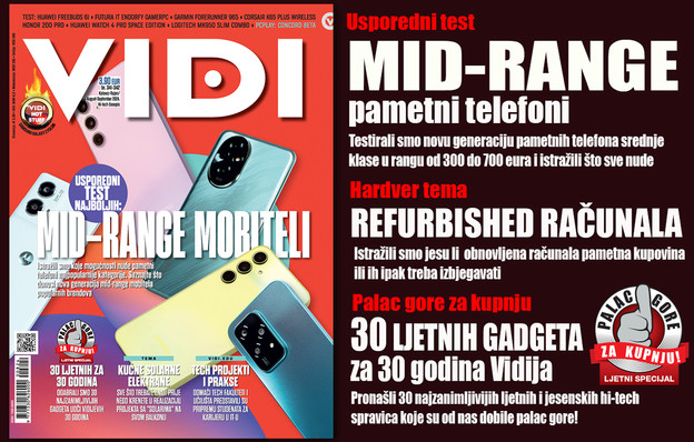 U dvobroju časopisa VIDI za kolovoz i rujan 2024. donosimo obilje zanimljivih tema i testova među kojima su usporedni test novih odličnih telefona srednje klase, tema o isplativosti kupnje obnovljenih "refurbished" računala, Palac gore za kupnju 30 najboljih tech gadgeta, a tu je i tradicionalni VIDI-edu pregled najboljih hrvatskih tech fakulteta i učilišta.